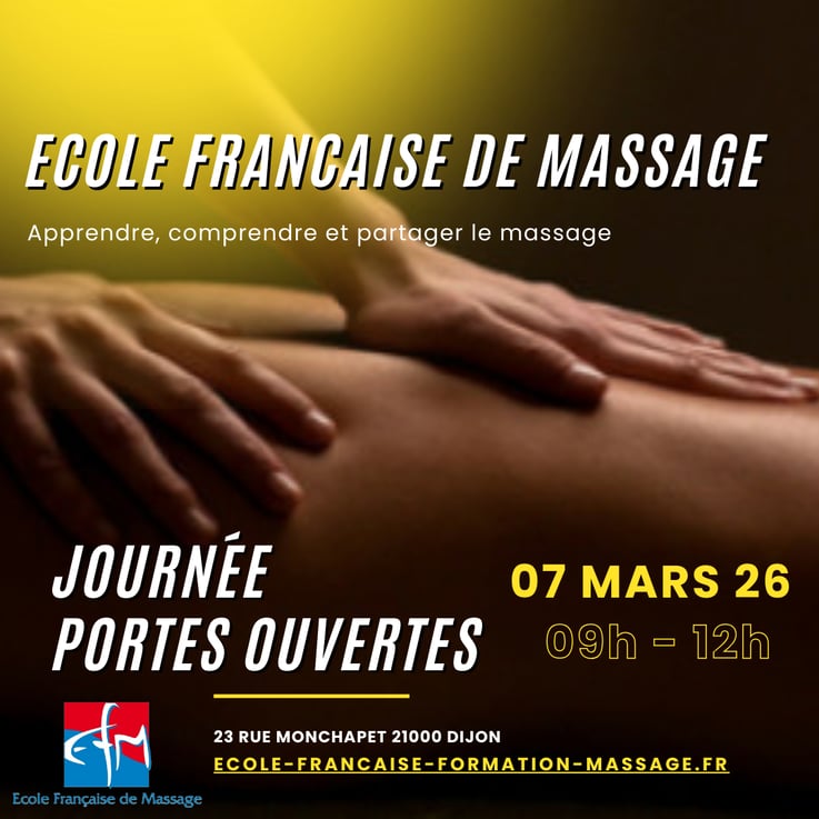 L’École Française de Massage - EFM dispense une formation de base complète et généraliste en massage bien-être non thérapeutique, qualifiante en 1 an, accessible à tous, sans prérequis, compatible avec une activité professionnelle, visant à développer une expertise de haut niveau dans le monde du massage bien-être. La formation se déroule en PRÉSENTIEL.